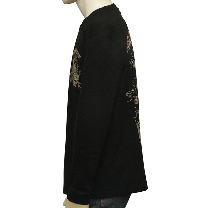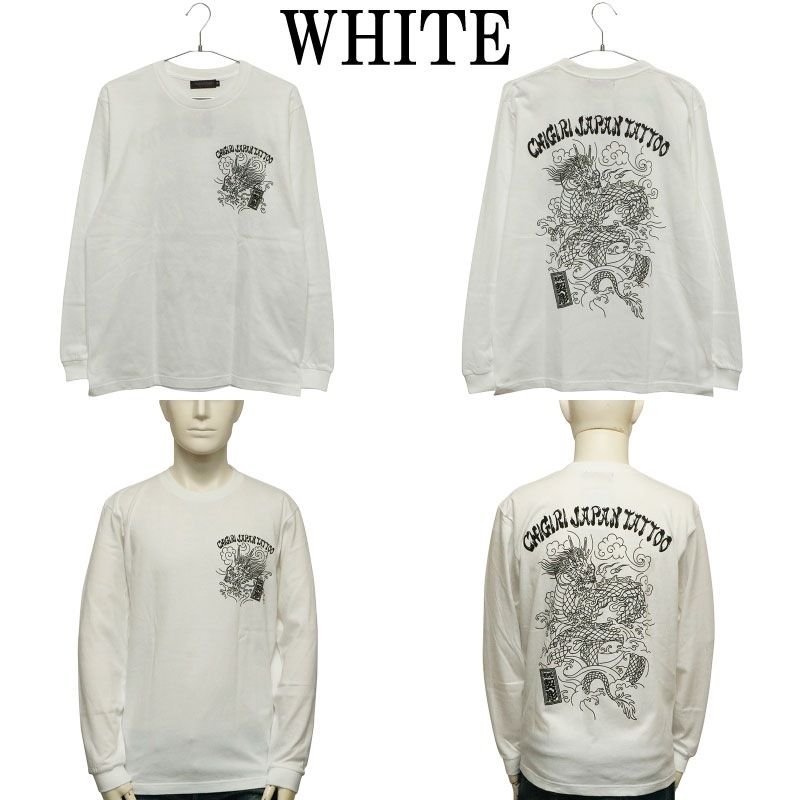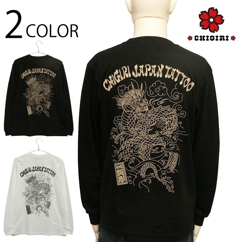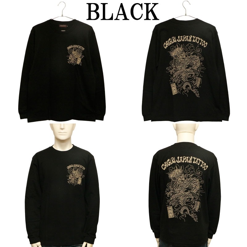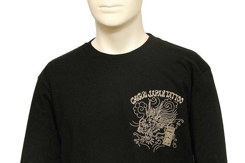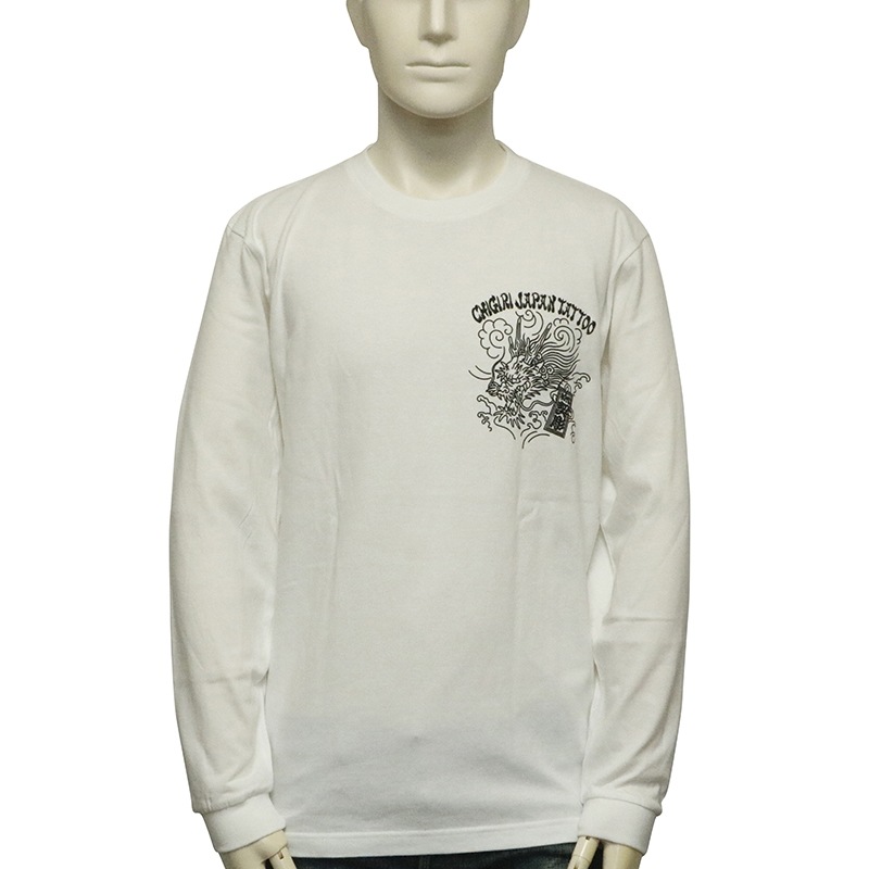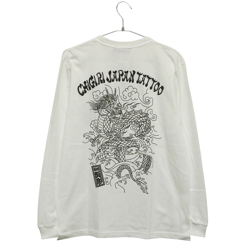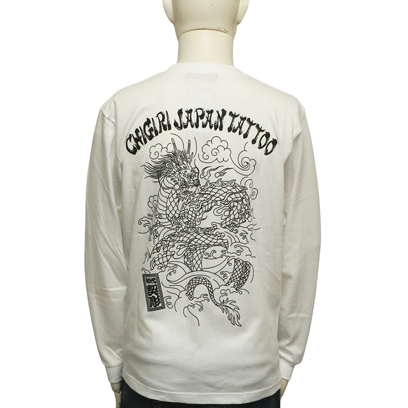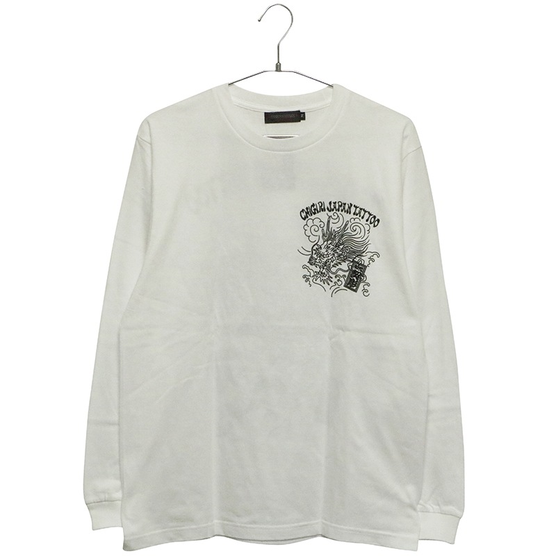 刺青の筋彫り調に描かれた龍を背面に落とし込んだ長袖Tシャツ。