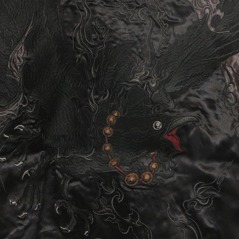 暗闇の中翼を大きく広げ飛ぶ八咫烏を迫力ある構図で刺繍し背景に怪火を刺繍で落とし込みました。