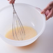 卵黄を泡だて器でよく溶き、グラニュー糖25gを加えて、よく練る。水を加えてさらに混ぜ、サラダ油を加え、なめらかになるまで混ぜる。