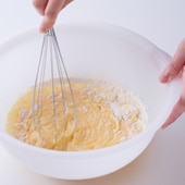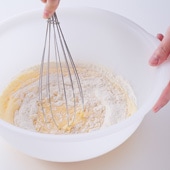 泡立て器を使って、ボウルの底からすくいあげるようにして、切るように混ぜる。このとき、薄力粉がしっかりと混ざっていることが大切。