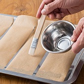 クッキングシートをひいたトレーに(4)を流し、電子レンジ(500w)で約3分半加熱する。ラップをして冷ます。