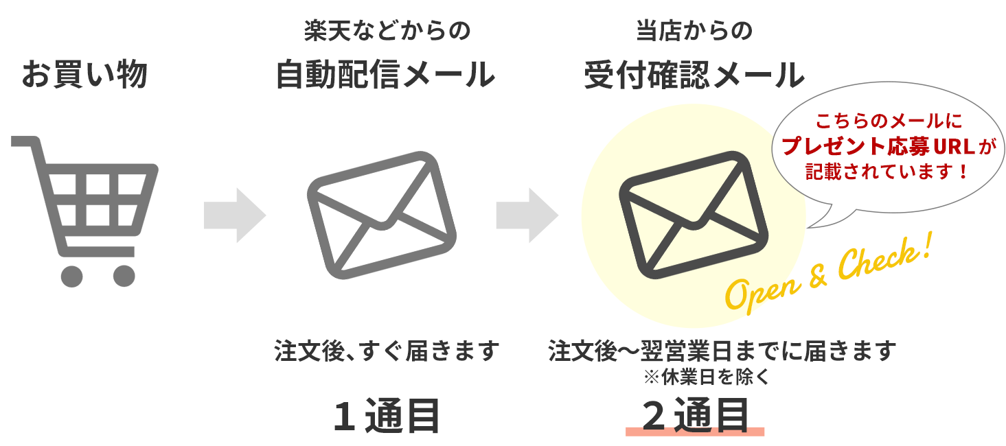 ※楽天市場やYahoo!ショッピングから注文後すぐに届く自動配信メールではなく、当店からの受付確認メールに応募ページURLが記載されています。