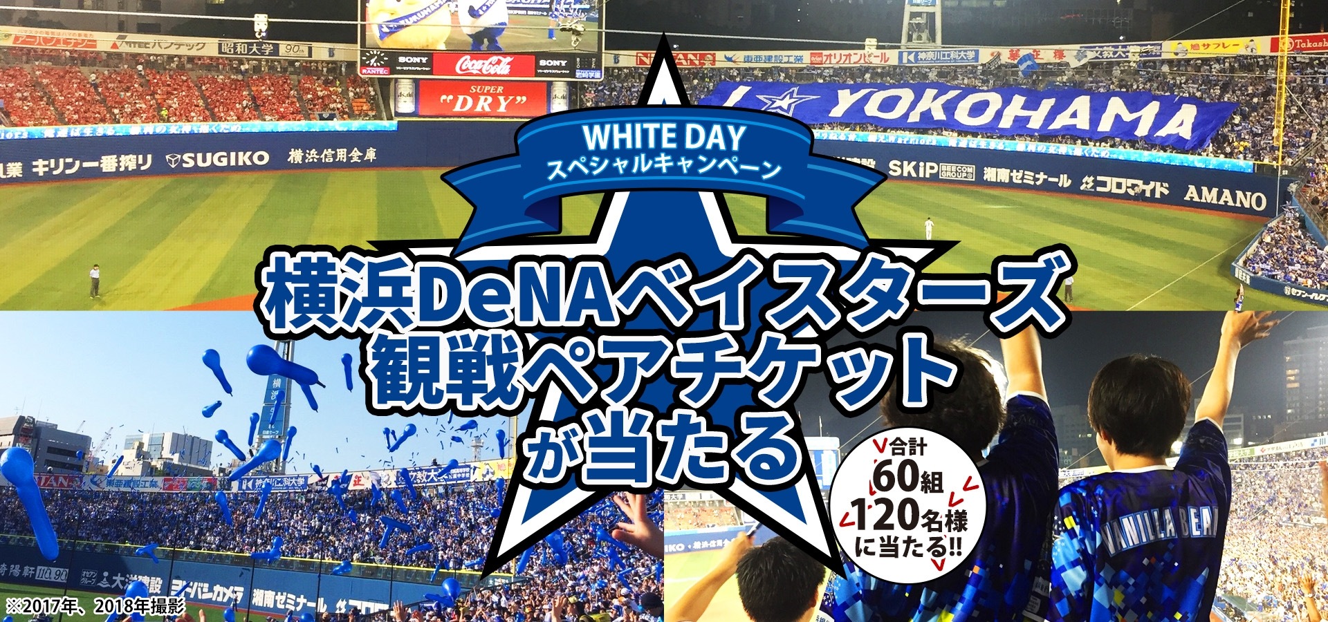 今年のホワイトデーでは、バニラビーンズオンラインショップでご購入いただいた方の中から、抽選で横浜DeNAベイスターズ観戦ペアチケットが当たる「ホワイトデースペシャルキャンペーン」を実施いたします!横浜でしか味わえない ワクワクが当たるチャンス!皆様のご応募お待ちしております!