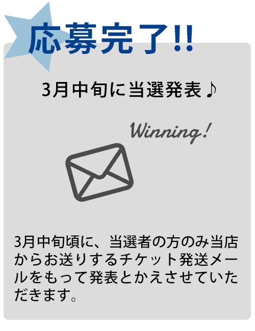 ■当選発表は、当選者のみに当店からお送りする"チケット発送メール"をもって発表とかえさせていただきます。