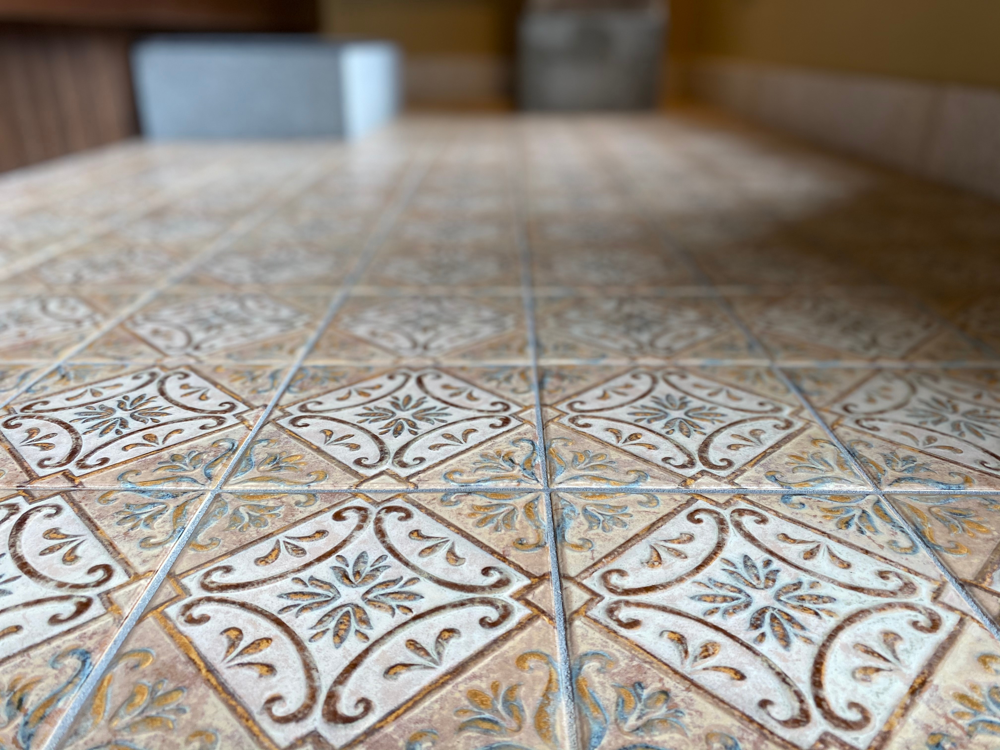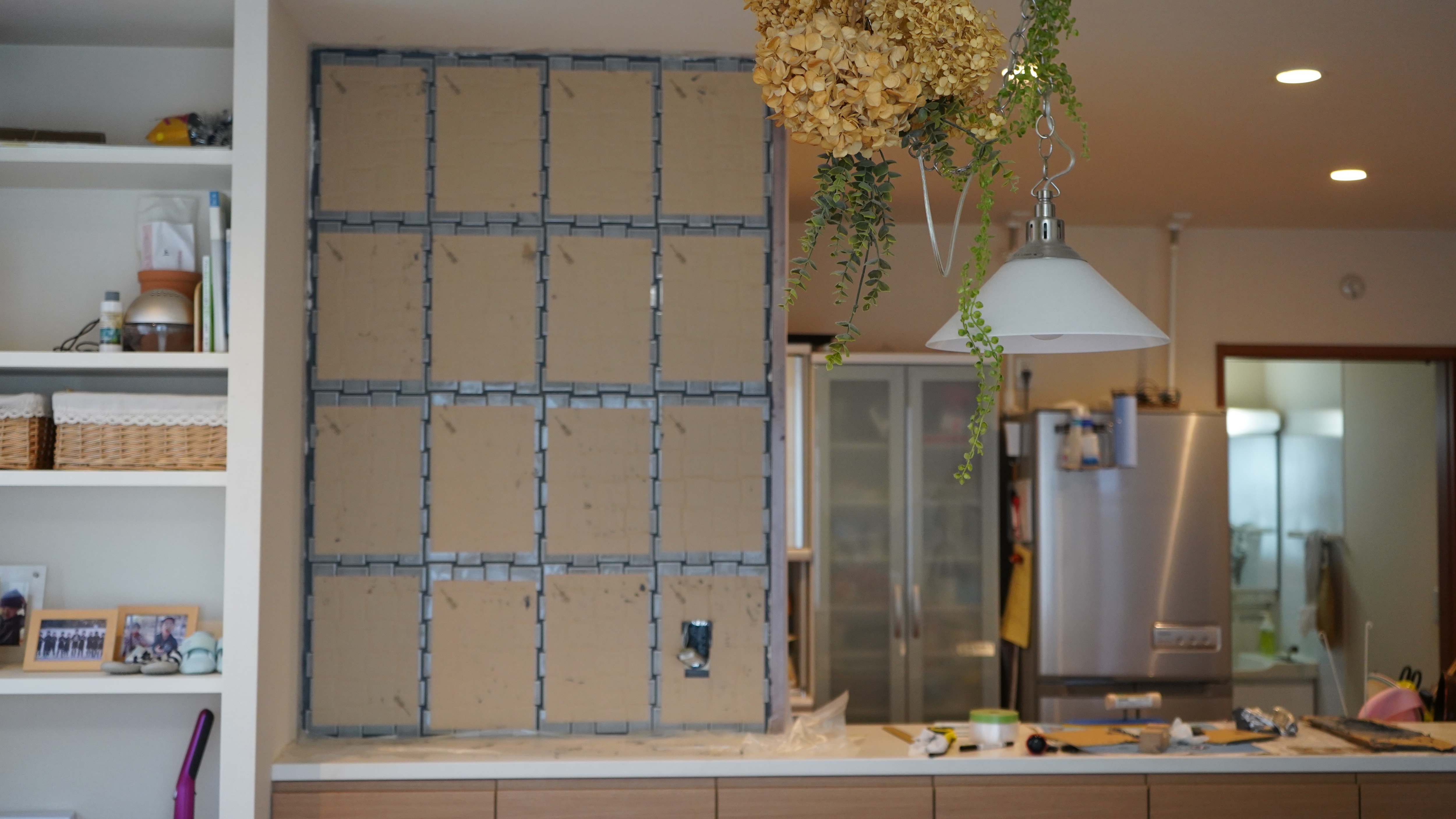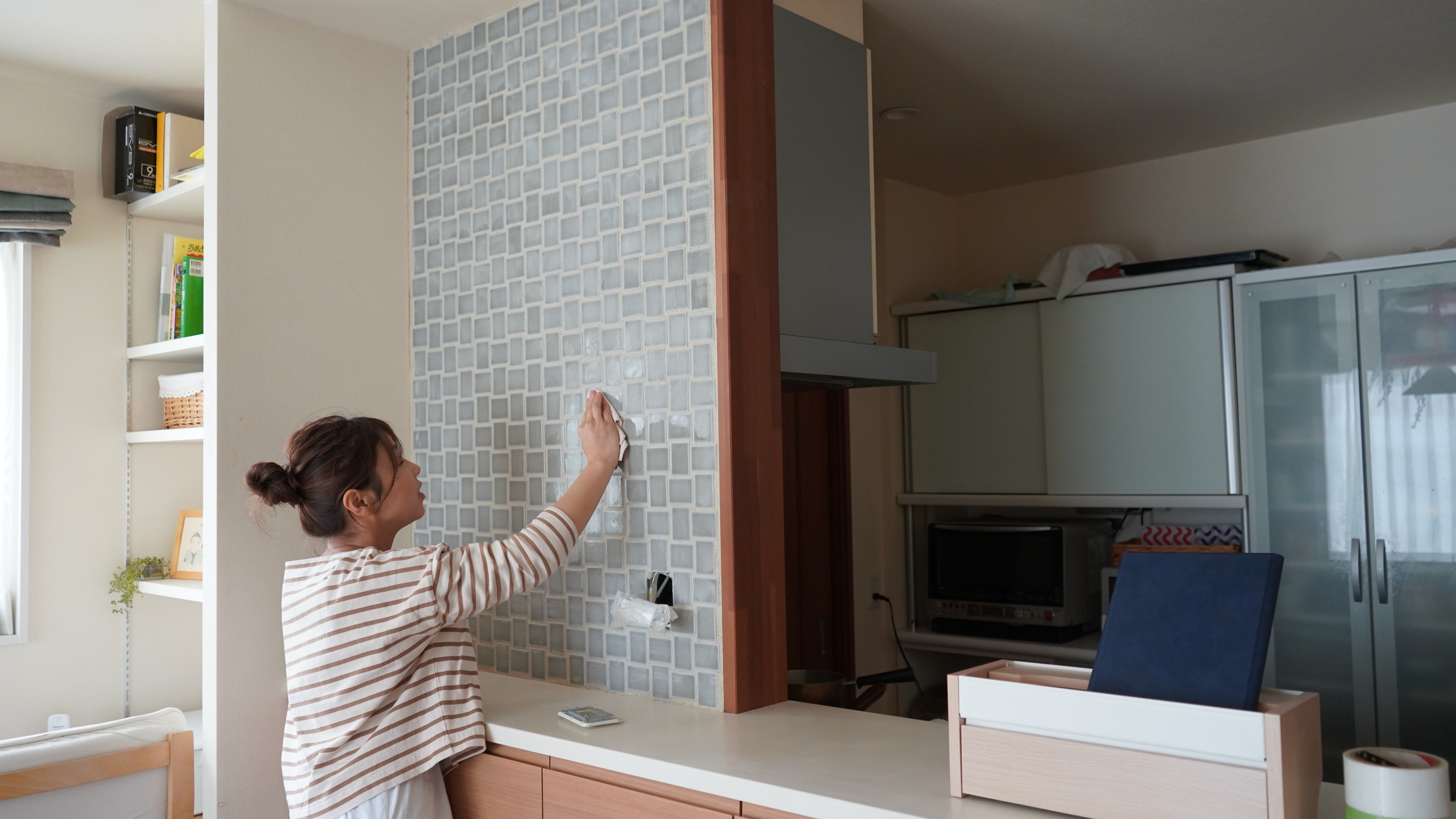 タイルを切断する必要がある場合、施工前にきちんと採寸してカット、タイルを全て用意することがとても大切ですが、彼女の場合、偶然にもタイルシートをカットすることなくサイズがピッタリでした。そのため、そのまま貼り付けることが出来ました。