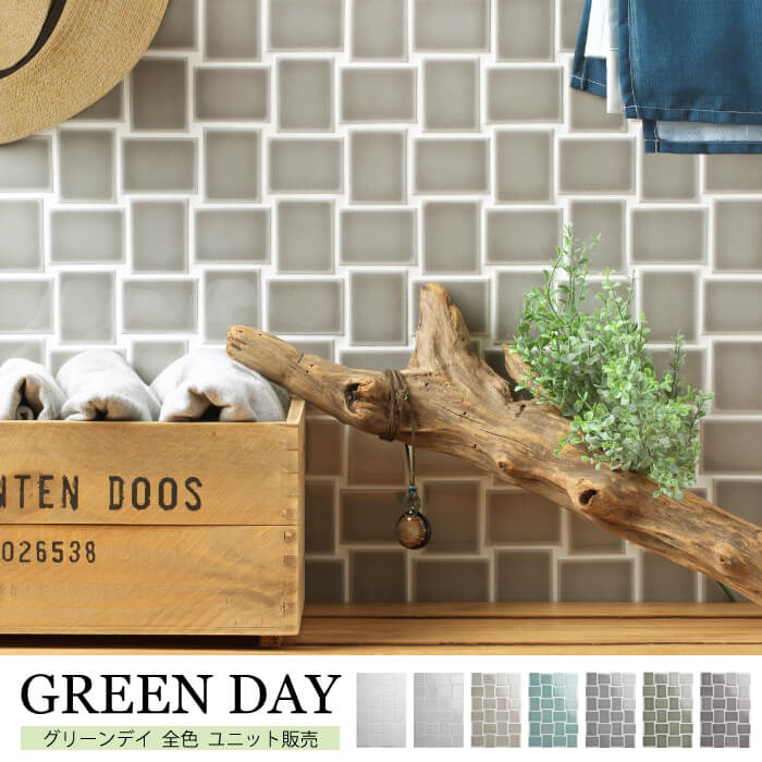 異形モザイクタイルの「グリーンデイ」を使って、初めてタイル施工に挑戦したスタッフ。