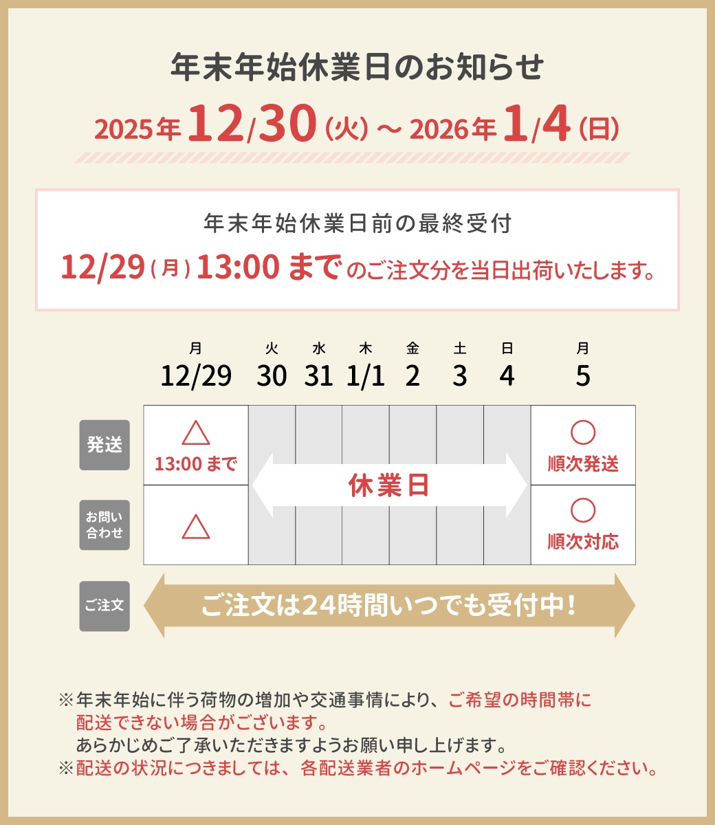 年末年始に伴う荷物の増加や交通事情により、ご希望の時間帯に配送できない場合がございます。