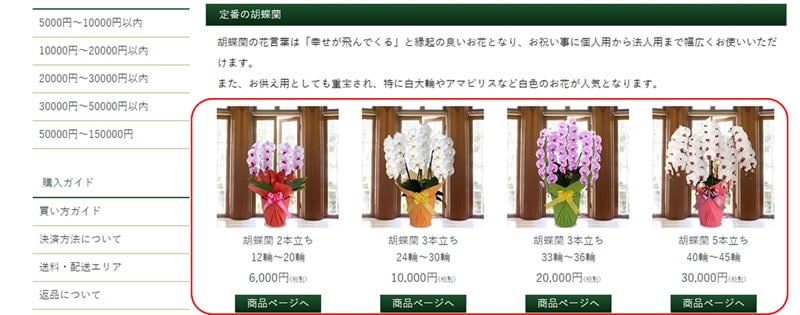 「胡蝶蘭のラッピングサービスについて」「配達エリアについて」「開花状況について」