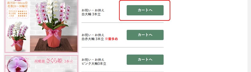 - 1-5.ページ内下部にある花色一覧から欲しい花色名の横の「カートへ」をクリックする