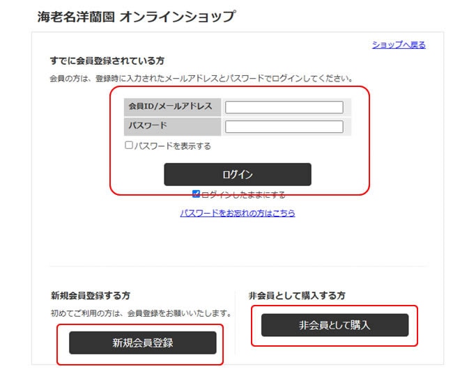 - 2-2.当店会員様はログインを、非会員様で会員登録を希望の場合は「新規会員登録」を、