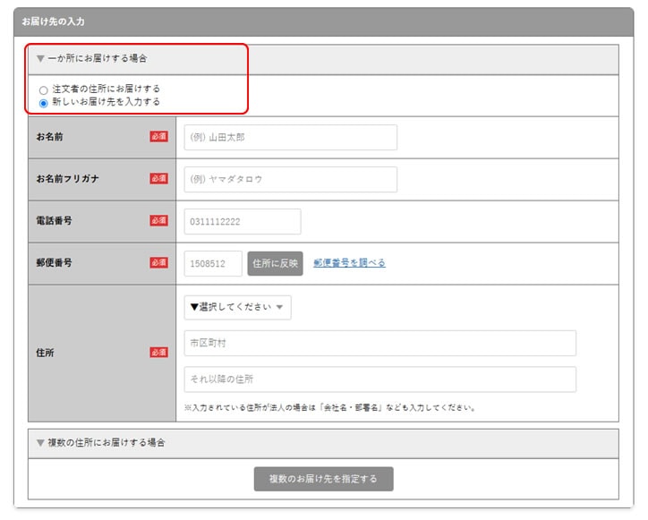 「注文者の住所にお届けする」or「新しいお届け先を入力する」の任意の方を選ぶ - 2-4. 「お届け先の入力」欄にてにて、