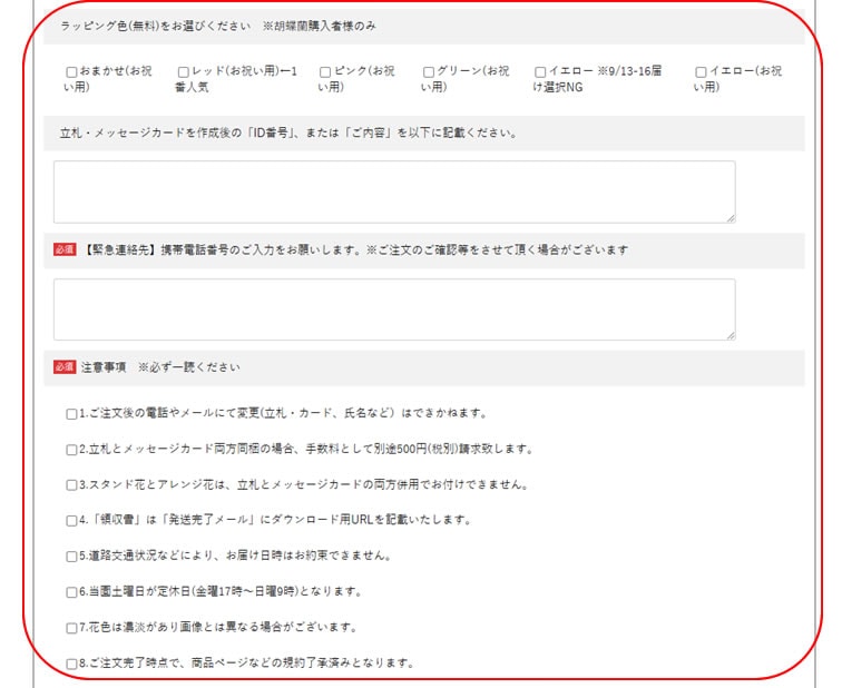 - 2-7.「注文備考」欄の項目選択肢にチェックをお入れいただき、