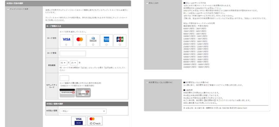支払方法は「クレジットカード決済」「後払い.com」「請求書支払い(法人名義のみ)」 となります