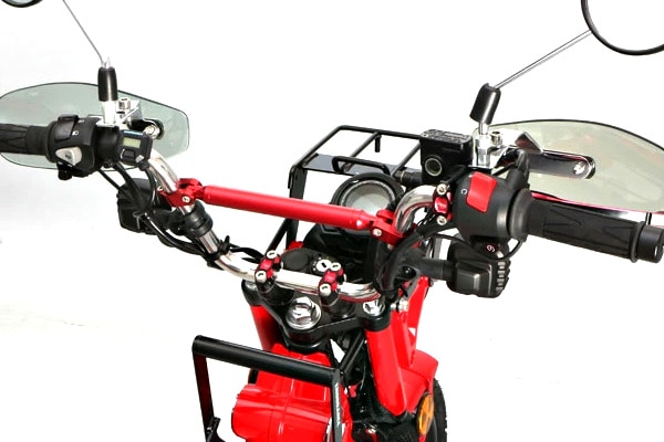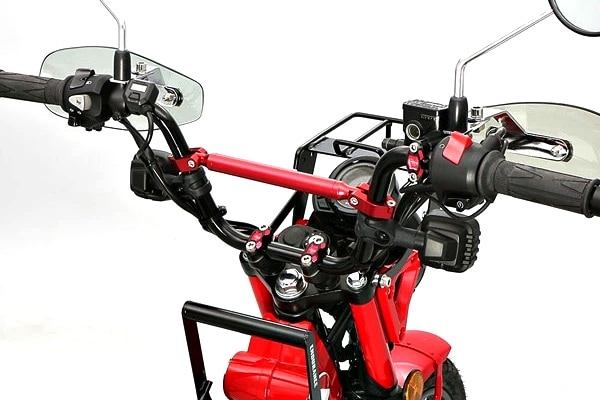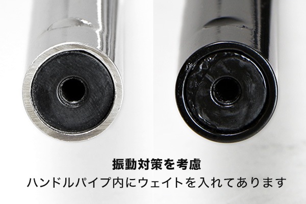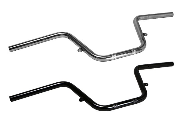 純正のハンドルに対して、幅はほぼ同等で、高さが約30mm高くなり、ハンドルの角度も約10°拡げてありオフロードバイクに近いハンドルポジションとなっております。