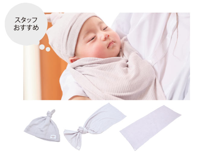 手触りがとても良く、赤ちゃんに直接あたるものだからこそ、安心して使えるのが嬉しいです。帽子も真夏の時ちょっと外に出かけるのに紫外線が心配だったことと、頭皮に乳児湿疹もあったため通気性の良い所も気に入りました。真夏にニット生地素材のおくるみって暑そうなイメージでしたが、生地がさらさらで付けたまま気持ちよさそうでとても愛用しています。