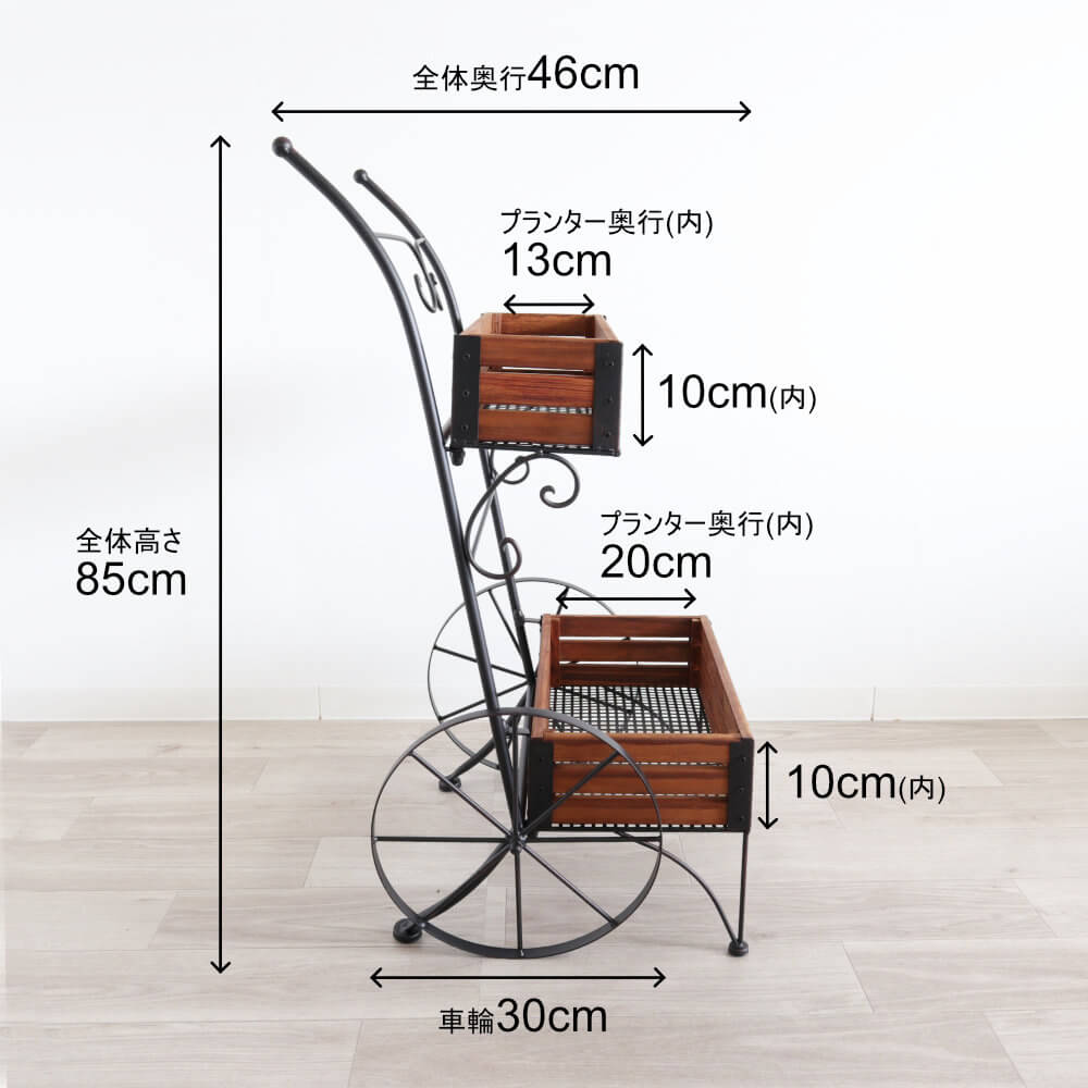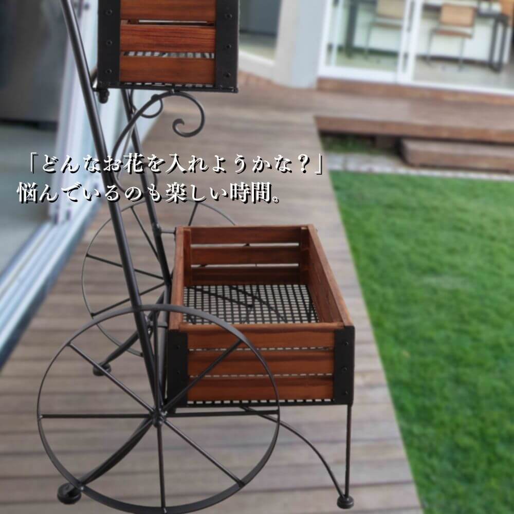 車輪の太さと細さのバランスがとてもキレイです。影絵にでてきそうな印象を与えてくれます。横から見ても絵になるプランター。