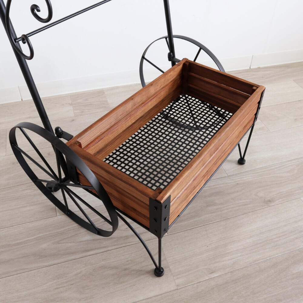 ヨーロッパの路上で花売りをしているようなデザインのフラワーカート。細身のアイアンと車輪のバランスが格好良くおしゃれです。アラベスク調のアイアン飾りも、お花を入れる事を考えてシンプルですっきりとしたデザインです。