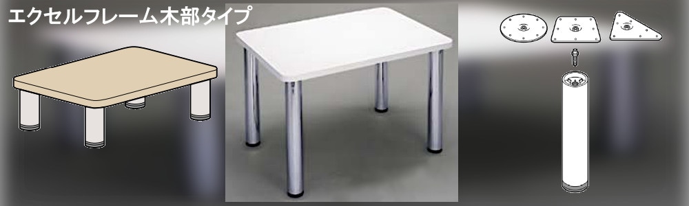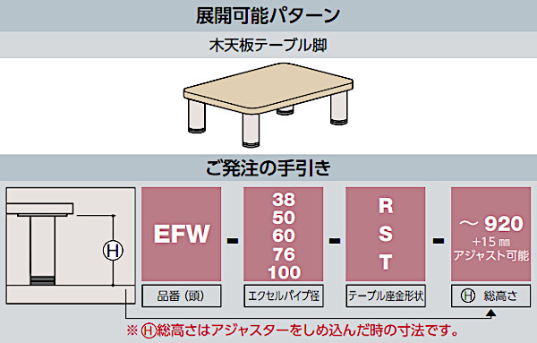 木天板用テーブル脚(EFW)の販売単位は 1 本 です(座金+アジャスター付パイプ脚、記載サ イズはネジ込んだ最少寸法の全長)。テーブル 構成のためには通常 4本必要です。