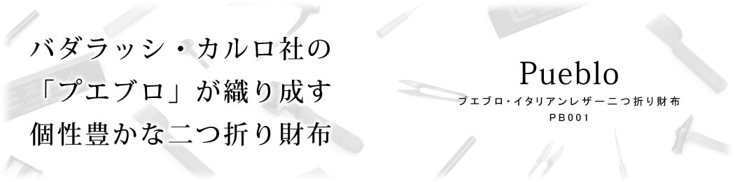 イタリア、トスカーナの名タンナー「バダラッシ・カルロ社」。古典的な植物タンニン鞣しの中でも特に素晴らしい革が生まれる製法である、牛脂を使用したバケッタ製法を復刻させ、時間とコストを掛けてでも高品質の革をつくるために必要なレシピを使うという、明確なコンセプトを持った希少なタンナーです。中でも「ミネルバボックス」は世界的に有名な革です。そんな名タンナーがつくりだす数ある革の中でも特徴的なのがこの革「プエブロ」。プエブロとはプエブロインディアンを表し、民族的な表情と温もりを持つ革です。製法はバケッタ製法を用い、吟面(革の表面のこと)を手作業で優しく擦ることで付く、細かな擦り傷のような文様が特徴で、少しざらついた独特な手触りとマットな質感、そして匂いがします。通常の吟擦り加工よりも吟面が多く残るため、経年変化も大きくより楽しむことができます。また、バケッタ製法は浸透しにくい牛脂を時間をかけてじっくりと浸透させているため、通常の革よりも油分が抜けにくく、メンテナンスはほぼ不要です。使うことで手から出る油分のみで十分です。染色についても近代的な手法ではないため、製造毎に色味が変わりますが、それもまた一期一会の楽しみです。他の革にはない唯一無二の個性ある表情を醸し出す素晴らしい革を存分にお楽しみください。