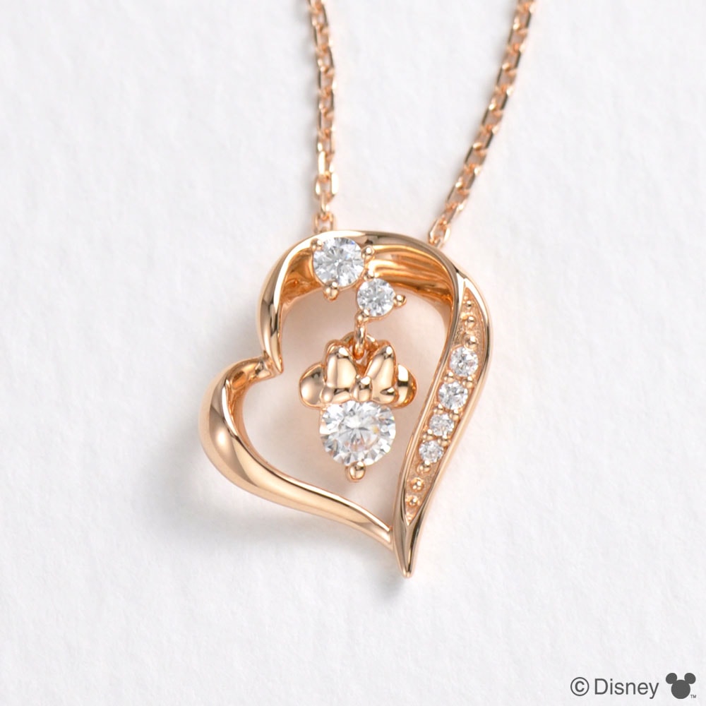 清楚な印象のシルバーカラーにクリアキュービックを合わせた可憐なハートモチーフネックレス。ミニーちゃんの顔を石で表現したなんとも可愛らしいデザインです。