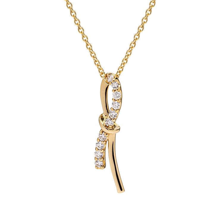 整然と並んだダイヤモンドがスタイリッシュな印象を残すストレートリング。中央にひねりを加え、レイヤードも楽しめる仕上がりに。