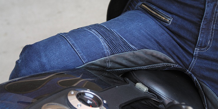 デニムパンツのひざにはヒップ周りと同じくケブラーを挟み込み、優れた耐摩擦性を発揮する。