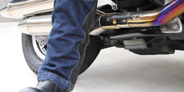 太ももとふくらはぎの内側に牛革のヒートガードを取り付けることで、エンジンやマフラーの熱から脚を守る。