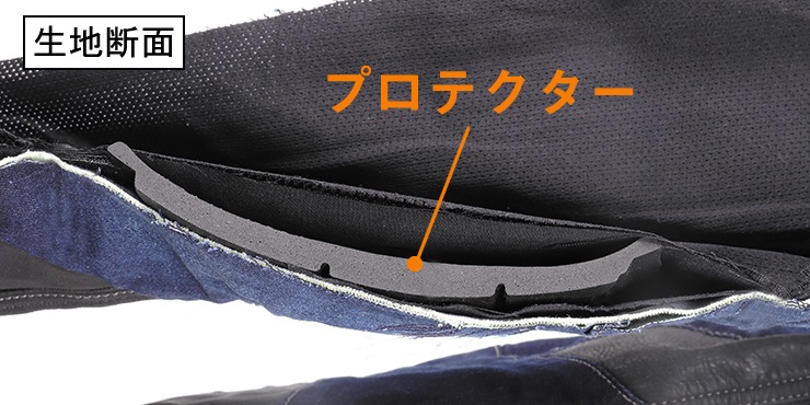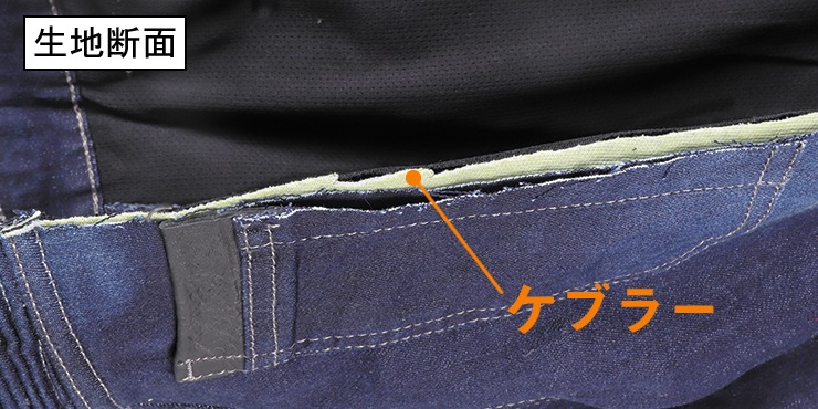 防護服や付属品、装備など、さまざまな製品の安全性と耐切創性の向上に利用されているケブラーをデニムとインナーの間に挟み込む。