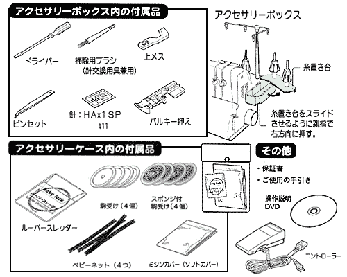 | 上記の別売アタッチメント(レース押えを除く)を1つにまとめたお買い得セットです。 |