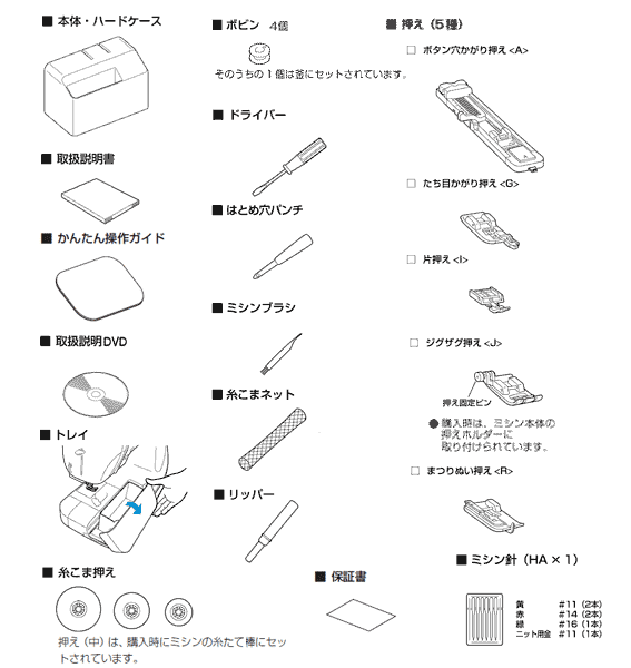 ハードケース、取り扱い説明書、早見表、取り扱い説明DVD、糸こま押え、ボビン4個、ドライバー、はとめ穴パンチ、ミシンブラシ、糸こまネット、リッパー、ボタン穴かがり押え、たち目かがり押え、片押え、ジグザグ押え、まつりぬい押え、ミシン針セット(#11(2本)・#14(2本)・#16(1本)・ニット用#11(1本))