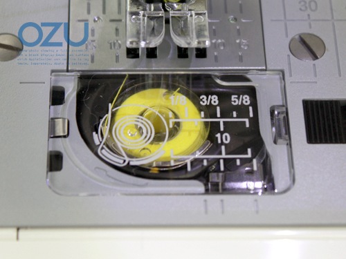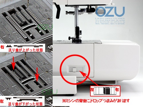 ミシンの背面から見て、向かって右が送り歯が上がっている通常モード