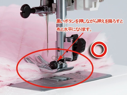 アップリケや、キルト縫いなど、フリーモーションで自由に縫う場合には、送り歯を下げる必要があります。