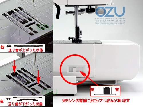 ミシンの背面から見て、向かって右が送り歯が上がっている通常モード