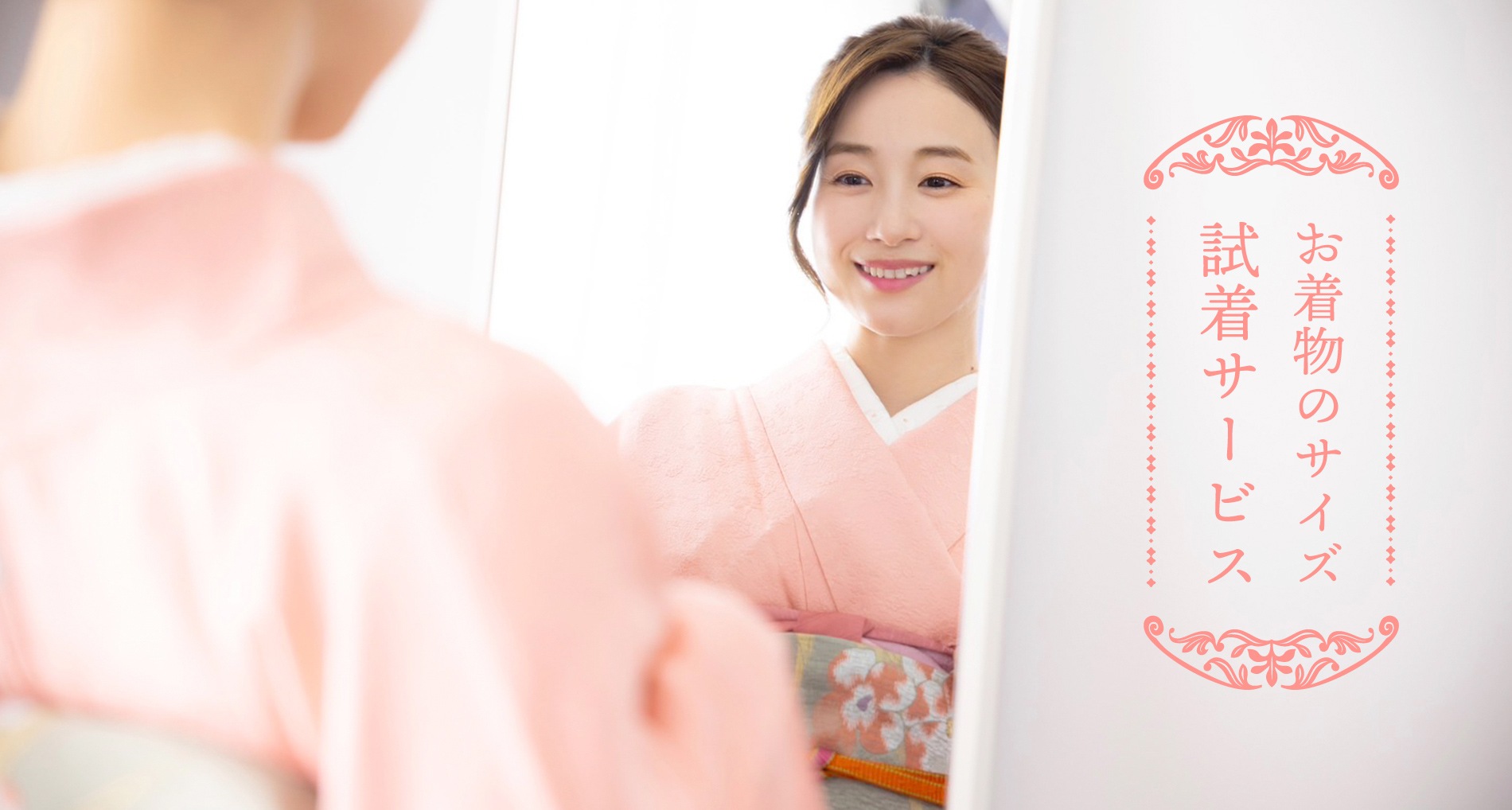 当店のお着物のサイズ感を、実際に着用してご確認いただくため、無地のサイズ試着用着物をお客様にお送りする『サイズ試着サービス』をご用意しております。