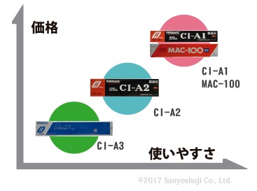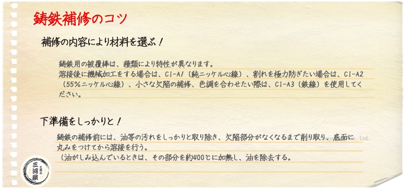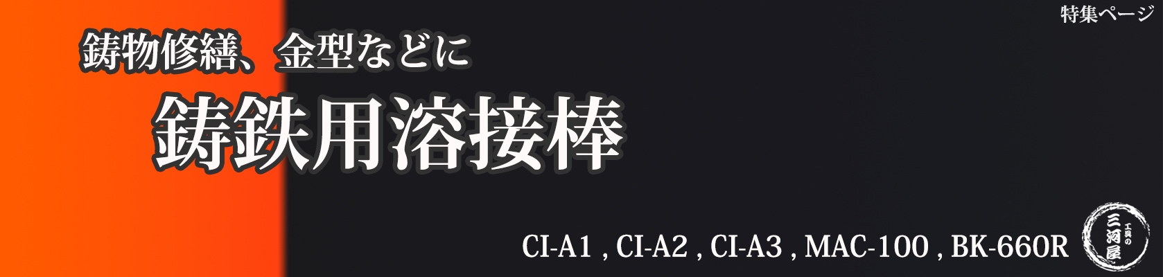 鋳鉄の溶接棒は、種類により特性が異なります。 溶接後、機械加工が必要な場所では純ニッケル心線のCI-A1やMAC-100を、 割れを防止したい場合にはCI-A2を、 色のなじみを重視したり、小さな欠陥の補修では純鉄心線のCI-A3を使用します。