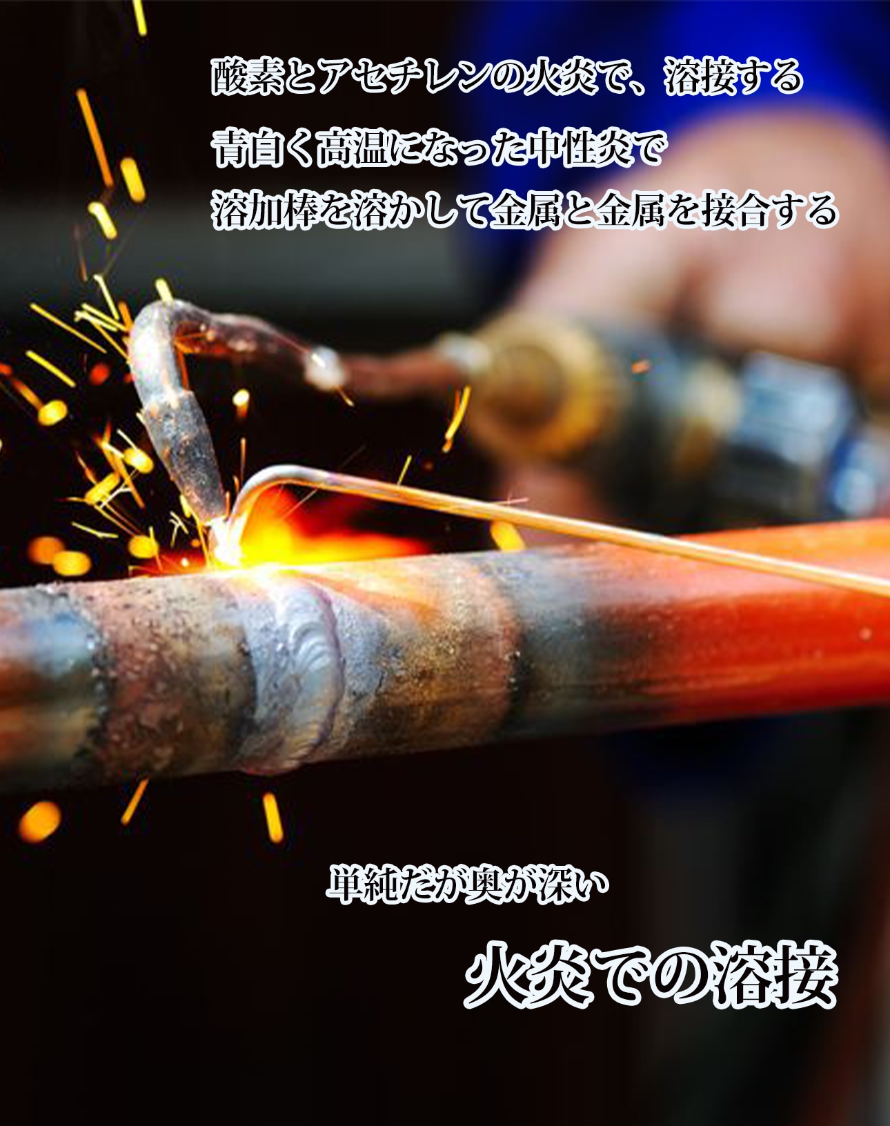 熔接機の火炎を中性炎に調整し、母材を加熱し、溶加棒を溶け込ませる