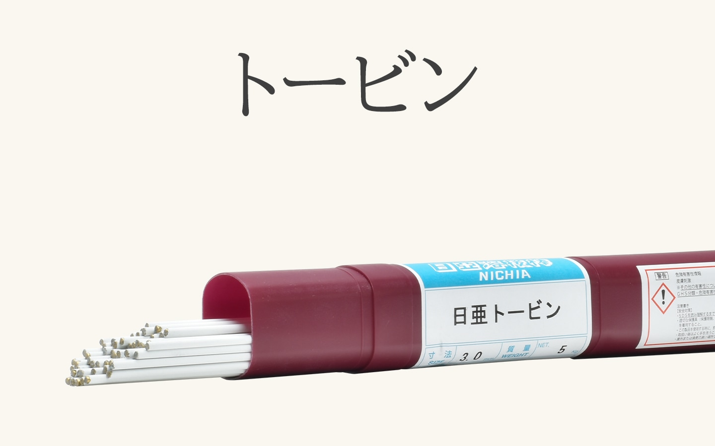 日亜トービン(トビノ棒)はトービンブロンズ心線にフラックスを被覆したガス溶加棒で、各種金属材料のろう付に広く利用されています。溶融金属の湯流れや母材に対するなじみがよく、また、ブローホールなどの欠陥がない、常に安定したすぐれた性能を持つろう付部が得られます。特に薄板用として最適です。