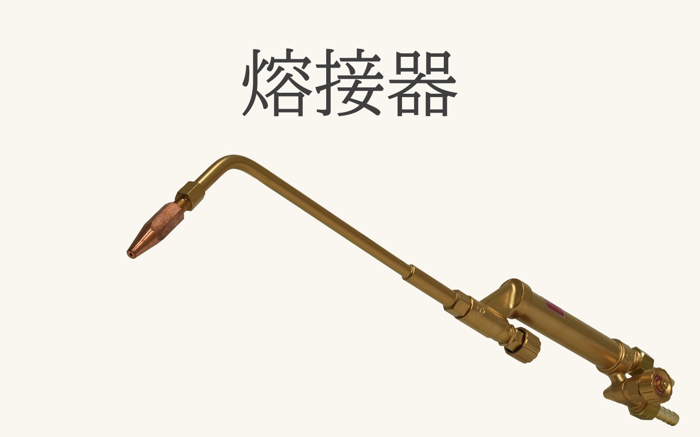 溶接器は、ろう材を溶かすための火炎の調整するために使用し、溶接器本体の大きさや火口の番手、流量調整ハンドルの調節により火炎の大きさを調節します。(溶接器は0号→小吹→中吹→大吹の順で大きくなります)