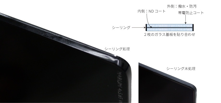 NDコートを内側に施したガラスを貼り合わせることで、表面のキズによる映像への悪影響をなくします。