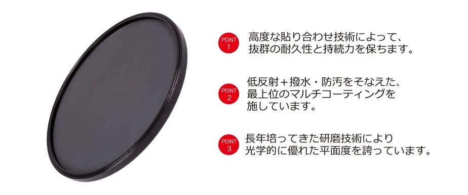 ・ 上記NDコートを施した2枚のガラス基板をコート面を内側に貼り合せることにより、表面のキズによる映像への影響を抑えます。この貼り合せはフォト業界で長年培ってきた偏光フィルターの貼り合せ技術を継承しています。