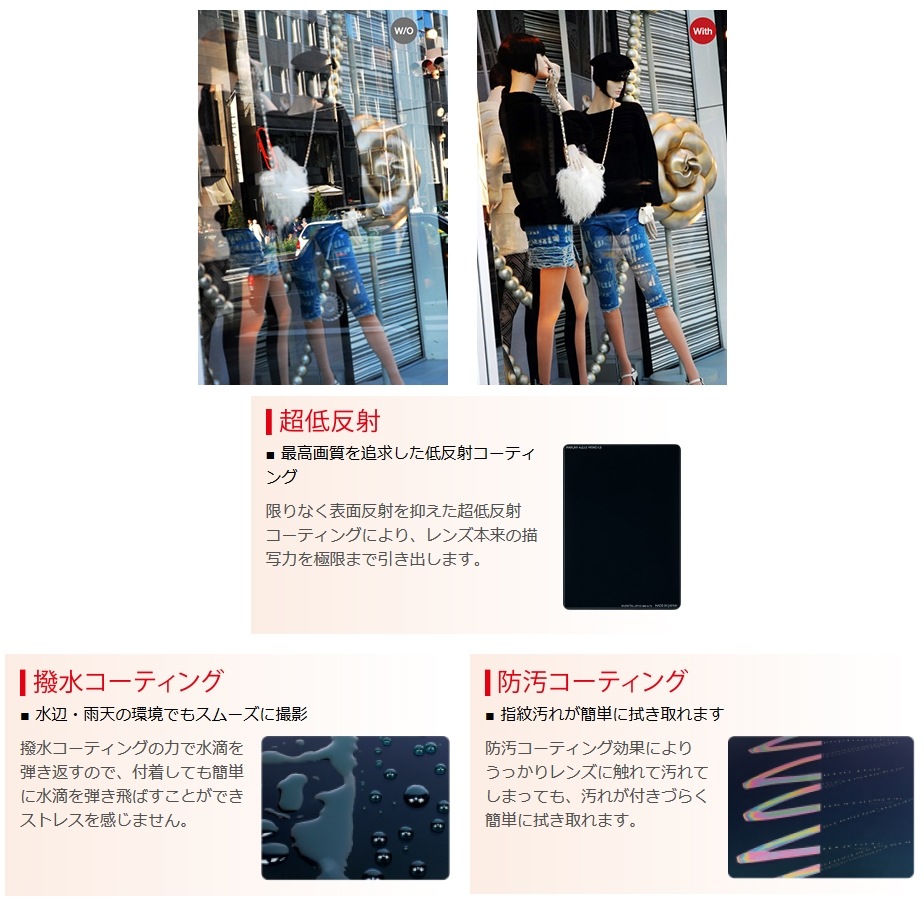 ・ 表面には低反射に加え撥水、防汚、帯電防止のコートを施し過酷な映像制作現場でもメンテナンスの手間を大幅に軽減することができます。